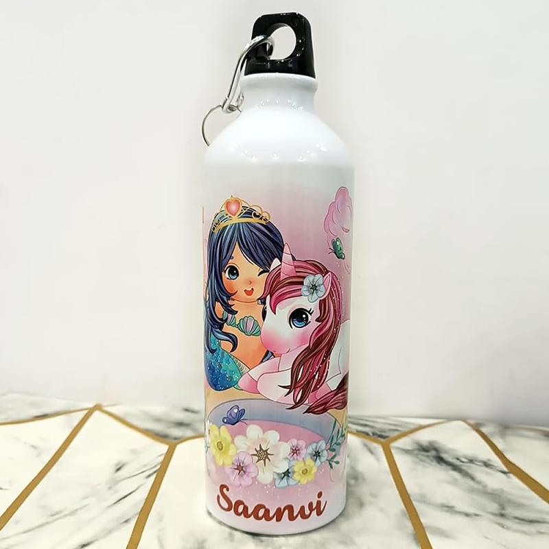 • CAPACITY – 600 ML Metal – White With Printed Mermaid Design With Name water bottle
